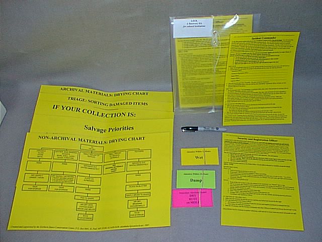 The A.R.K.: A Recovery Kit. Based on emergency personnel’s incident command system, the A.R.K. is used by museums throughout Minnesota. Created to assist disaster recovery, the A.R.K. leads staff through the first 24 hours of a musem disaster. Applicable to any disaster, the kit provides six laminated position description cards with fill-in resource lists on each, five collection recovery posters, name tags, permanent marker and recovery priority cards. Packaged in a waterproof envelope. The kit should be kept in one to three staff members’ cars, so it is immediately accessible.