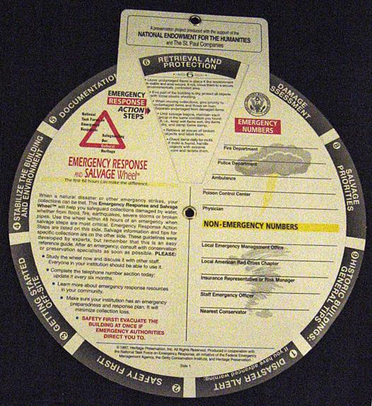 Emergency Response and Salvage Wheel helps staff prepare for a disaster and recover after one strikes. It is a nice compliment to the A.R.K. (above), fitting in its plastic sleeve.