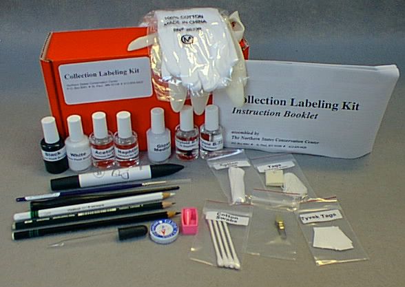 Collections Labeling Kit Based on work by the AIC/AAM Joint Committee on Numbering, this kit provides three ½ ounce brush top bottles of different clear lacquers, two bottles of solvents, and bottles of black and white acrylic inks. Included are three different ink applicators: a fine brush, a quill pen and an empty COPIC marker. Three different pencils, two that are water soluble, samples of different tags and ties, and gloves also are included. A small booklet provides information on how to use each of the items in the kit.